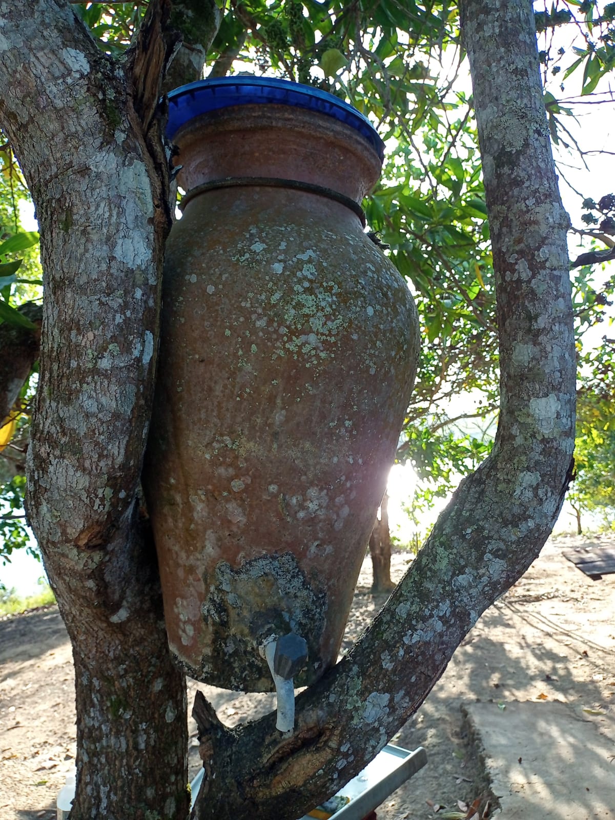 A título de descrição, um pote de barro com um torneira no fundo pendurada em uma árvore. Na verdade, uma grande tecnologia que durante décadas serviu como forma de armazenar água para o consumo humano.