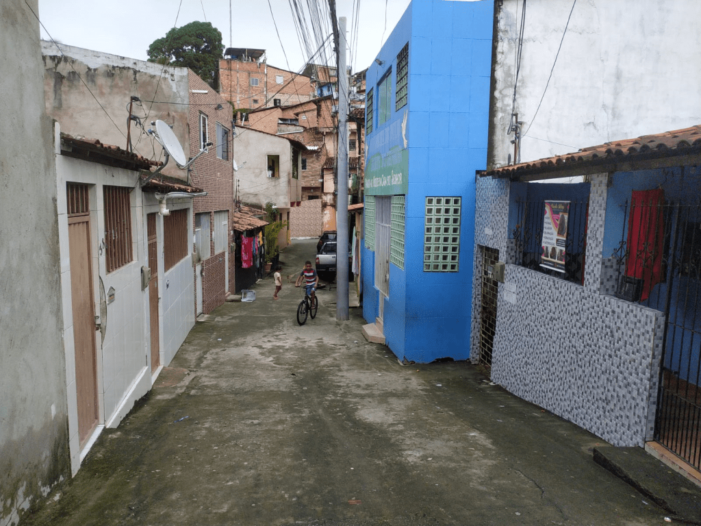 Para ajudar no entendimento. A rua onde eu morava, a Amaro Feitosa, é uma das descidas da escadaria da Rua São Domingos e saí na Rua São Jorge, a principal avenida da grota. Ao sair na rua principal e pegar a direita tem acesso a ladeira em direção a feirinha, ou, a esquerda em direção ao Parque da Grota do Cigano. Em frente é o encontro de duas casas e por trás é um paredão com outras dezenas de moradias.